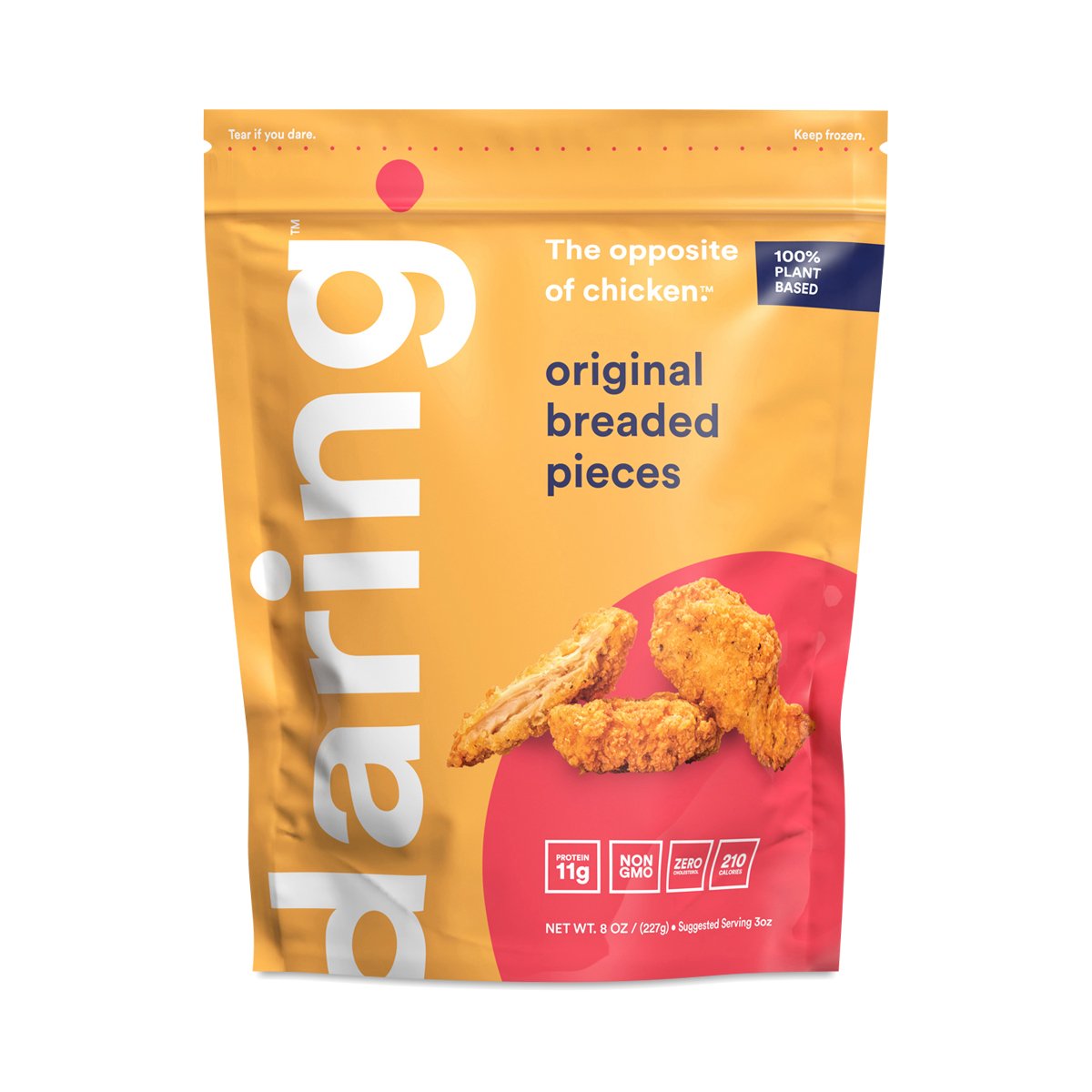 New to plant-inspired meats? Start with Daring’s original chicken pieces. These tender bites are made with soy protein (11g per serving), sunflower oil, and a spice mix featuring paprika, nutmeg, and cardamom, and a crunchy gluten-free breading.