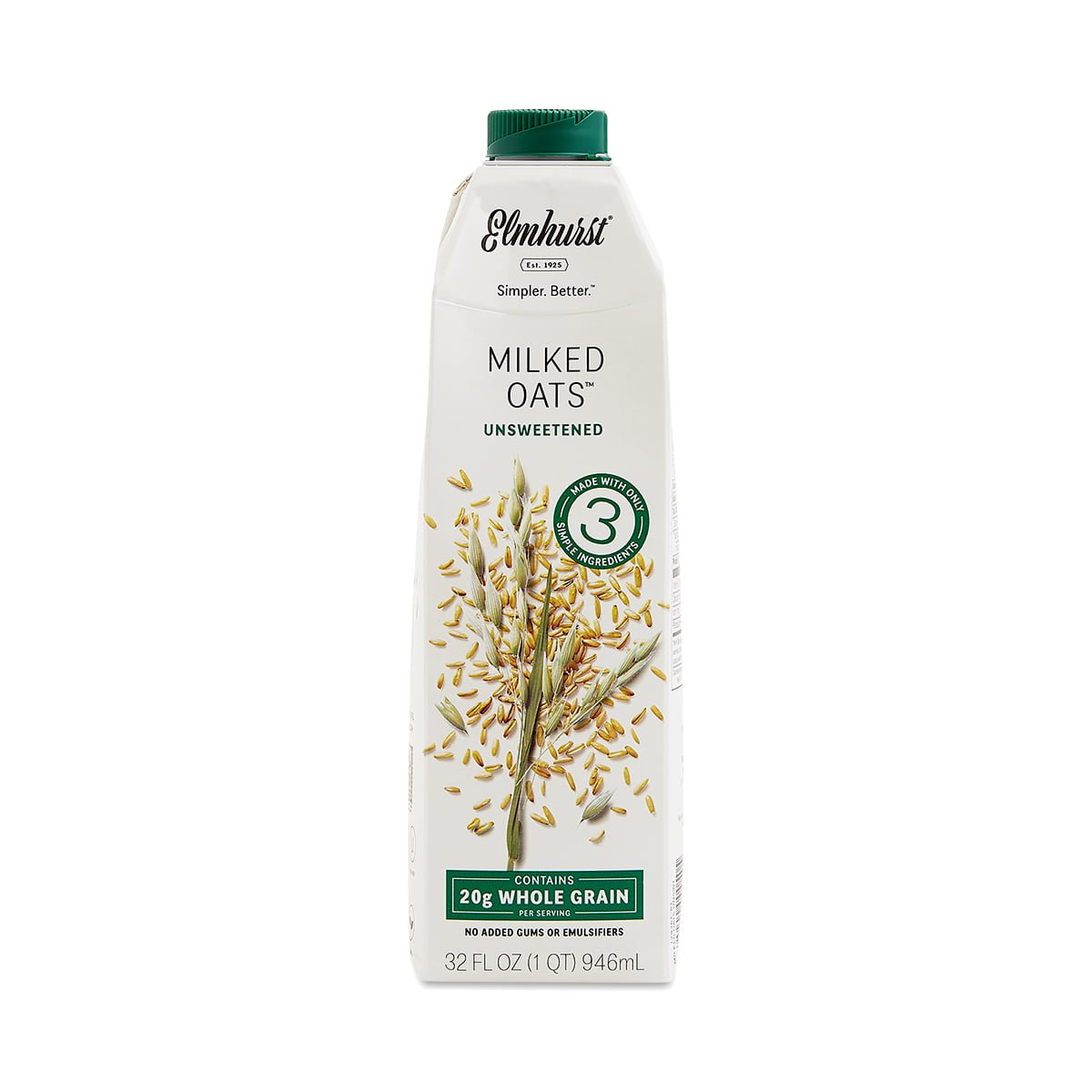 Made with just oats, water, and salt, Elmhurst’s Unsweetened Oat Milk delivers 20g of whole grains per serving, with no added gums or emulsifiers.
