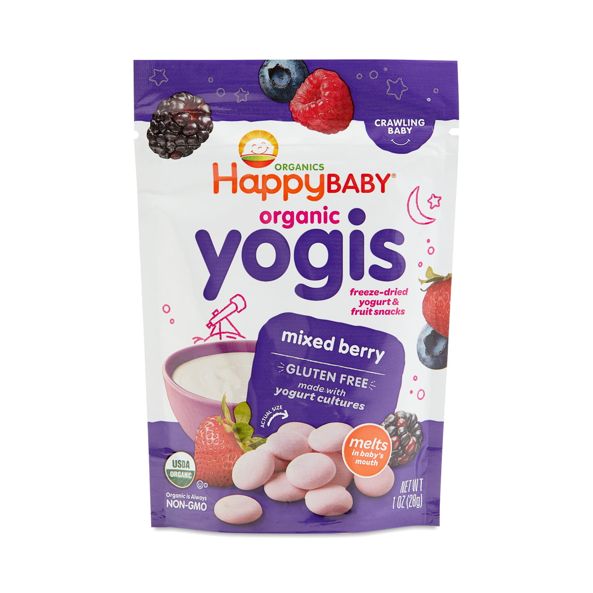 Mixed Berry Happy Yogis delight Babys taste buds with a burst of strawberry, blackberry, and blueberry flavor. These freeze dried organic yogurt drops melt in Babys mouth, and they taste so good, you may not be able to resist sneaking a few for yourself!