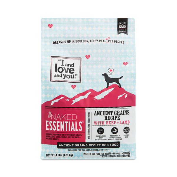 Naked Essentials, Ancient Grain Beef & Lamb from I and Love and You gives your pet good-for-you grains at every meal. In addition to oats, millet, quinoa, and sorghum, each serving delivers prebiotics and probiotics for added digestive benefits.