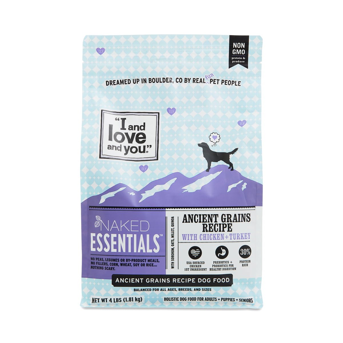 Real meat is the first ingredient in I and Love and You’s Naked Essentials, Ancient Grain Chicken & Turkey. In addition to a medley of oats, millet, quinoa, and sorghum, each serving delivers prebiotics and probiotics for added digestive benefits.