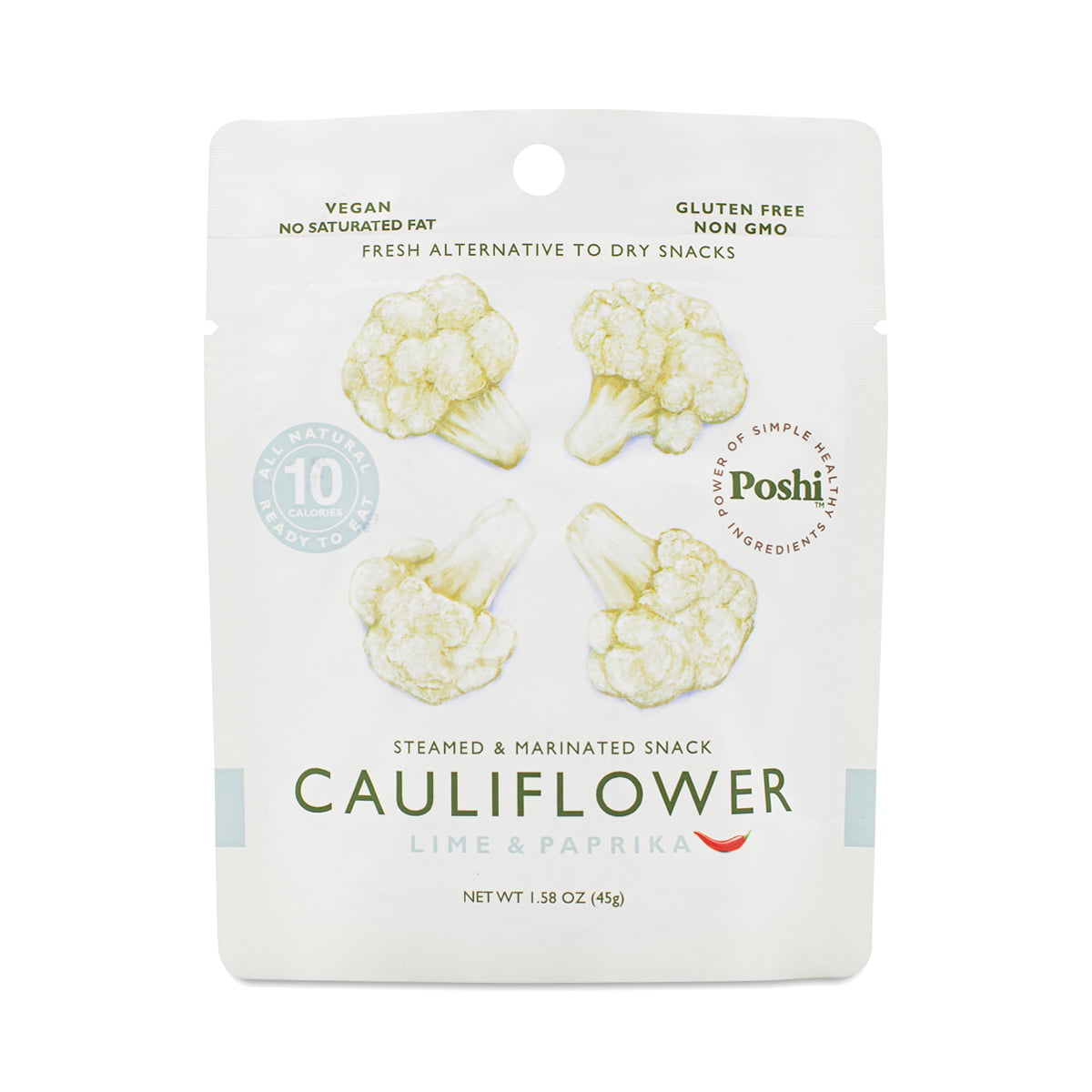 Steamed, marinated, and ready for your next meal, Poshi’s cauliflower is seasoned with zesty lime, roasted garlic powder, and a hint of paprika. This convenient pouch works for a variety of diets.