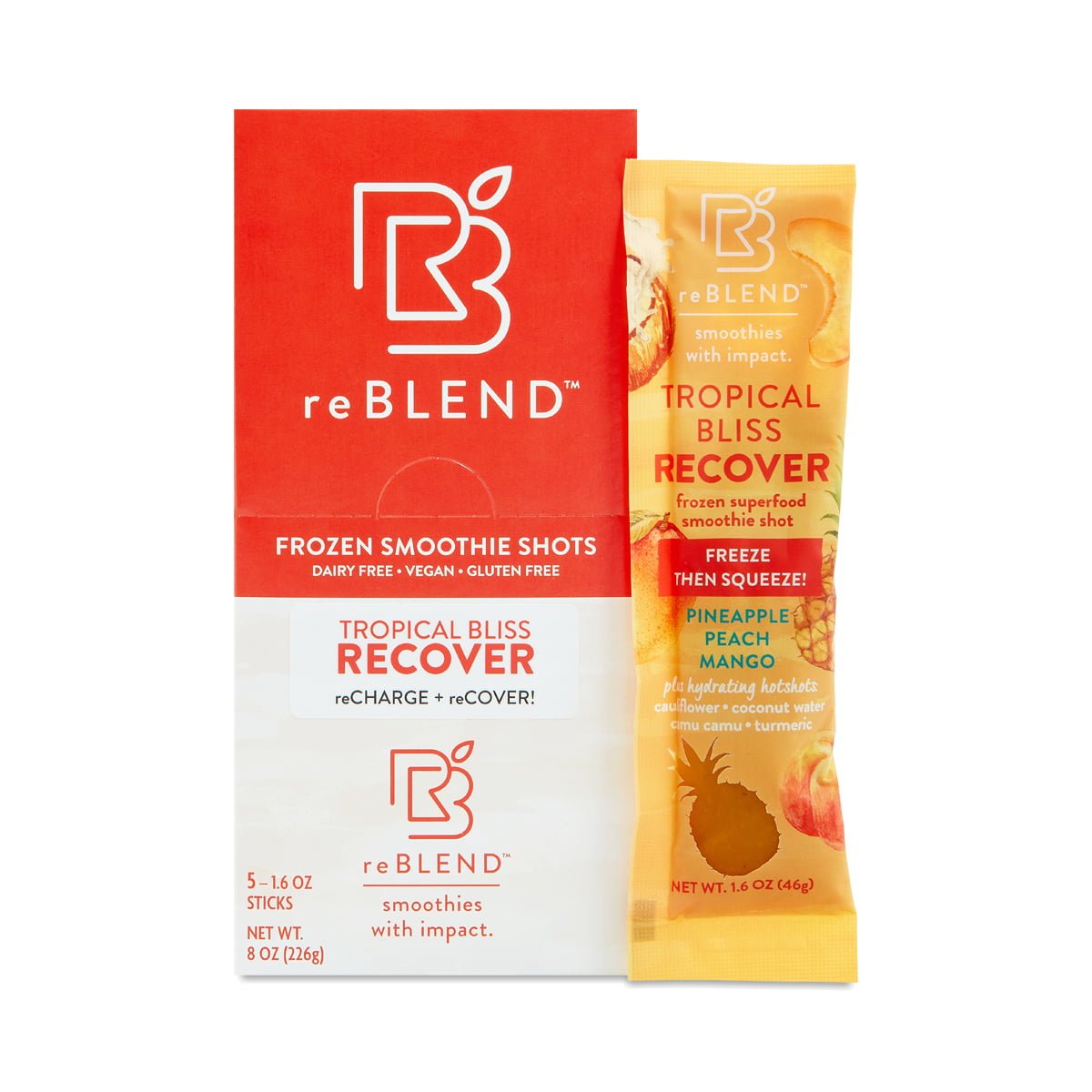 Pineapple, peach, and mango make for a tropical treat. In addition to a trio of sweet fruit, reBLEND packs its convenient freeze at home smoothie pop with other benefits like cauliflower and turmeric (for extra nutrition), camu camu (to support immunity), and coconut water (to encourage hydration). Just freeze and squeeze!