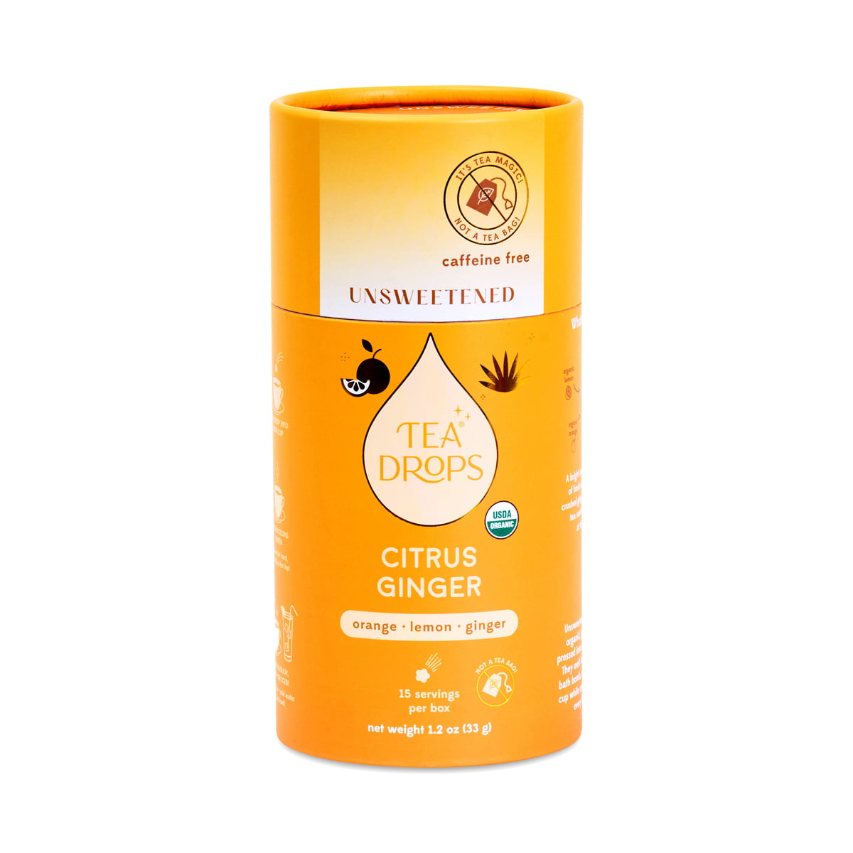 Enhance your tea ritual with Tea Drops. This bright blend of orange, lemon, and ginger is a convenient and caffeine-free way to enjoy a daily cuppa. Individual drops come in a recyclable cylinder and biodegradable paper box.