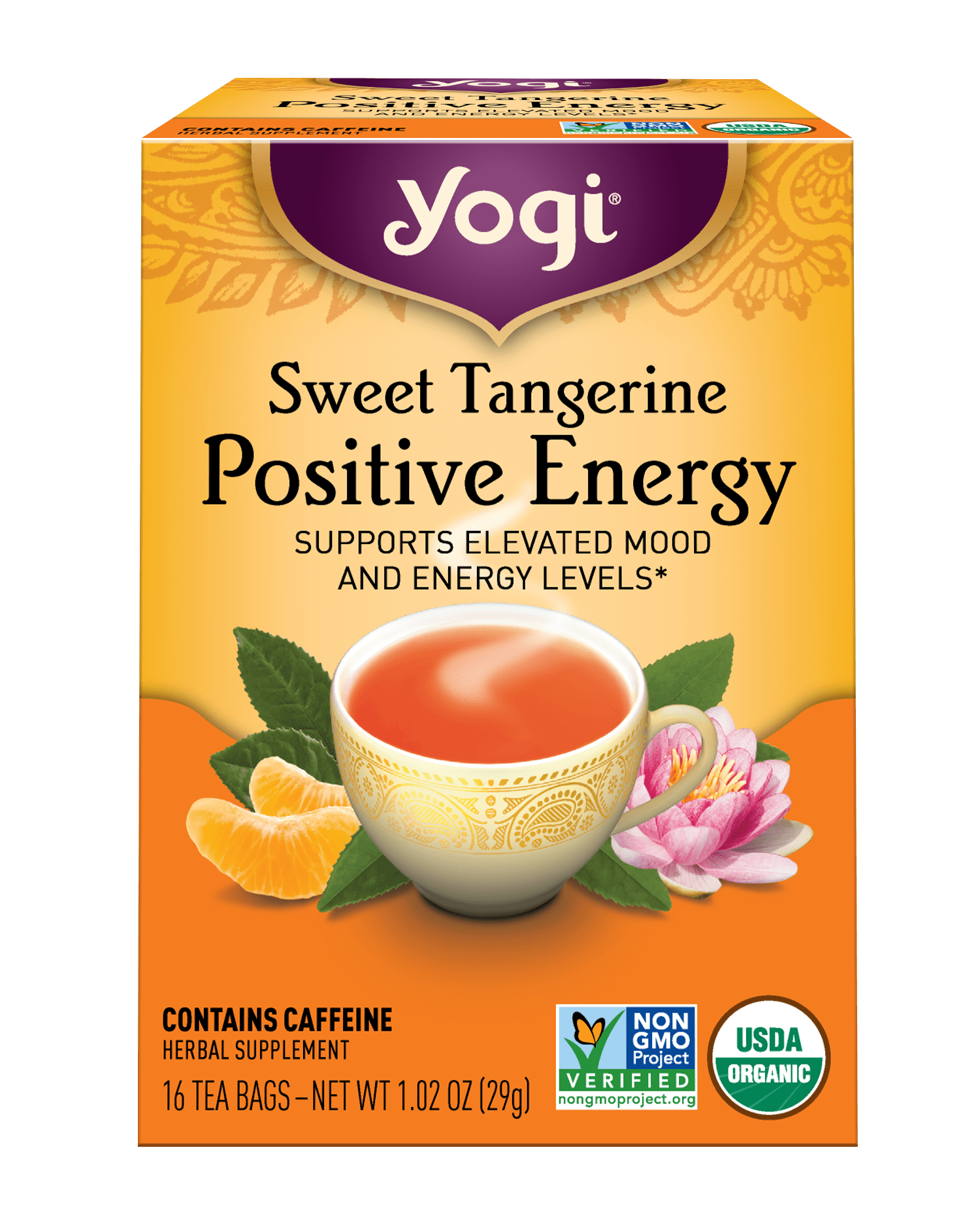 Yogi Sweet Tangerine Positive Energy tea combines Ashwagandha, an herb traditionally used to uplift the spirit; with an invigorating blend of Assam Black Tea and Yerba Mat Leaf to help provide energy.* Notes of Lotus Flower and Tangerine add sweet, floral, and fruity flavor. Uplift your spirit with an energizing cup of Yogi Sweet Tangerine Positive Energy tea, a bright and flavorful blend thats sure to leave you smiling.